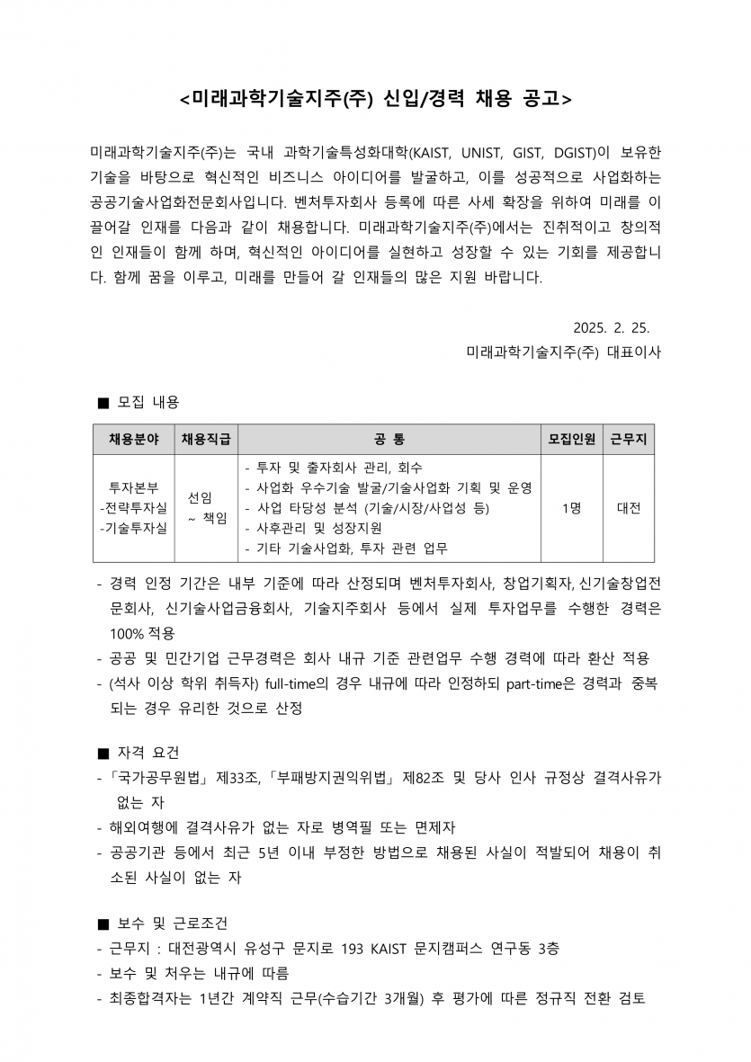 미래과학기술지주(주) 투자본부 신입/경력 채용 공고 작성자최고관리자 작성일25-02-25 13:11 본문 첨부파일 첨부파일 1 0.채용공고문_투자본부2025.02.25.pdf(163.9K) 첨부파일 2 1.미래과학기술지주_입사지원서2025.hwp(91.5K) 첨부파일 3 2.채용서류반환청구서_서식.hwp(34.5K) LIST
