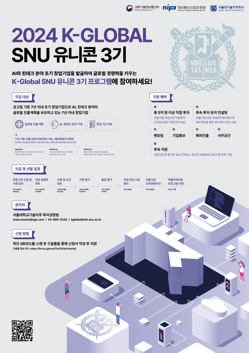 [유관기관홍보]서울대기술지주 2024 K-GLOBAL SNU유니콘 3기 프로그램 모집(~24.06.14.(금)까지) 작성자최고관리자 작성일24-05-16 15:54 본문 첨부파일 첨부파일 2 K-Global SNU 유니콘 3기 프로그램 사업공고문.hwp(91.5K) 관련링크 https://www.snuholdings.com/bbs/board.php?bo_table=notice&wr_id=81 109회 연결 LIST
