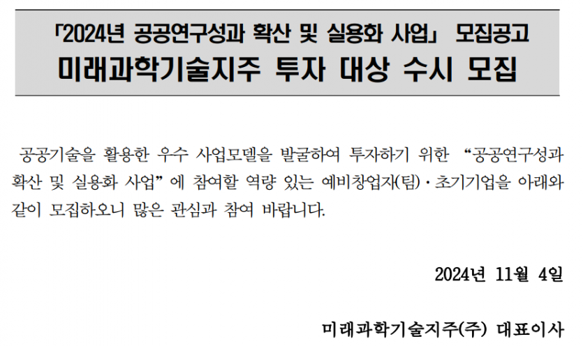 「2024년 공공연구성과 확산 및 실용화 사업」미래과학기술지주 투자 대상 수시 모집(~25.02.28.(금)) 작성자최고관리자 작성일24-11-04 16:06 본문 첨부파일 첨부파일 1 2024 공공연구성과 확산 및 실용화 사업 미래과학기술지주단독 수시모집 공고문.pdf(352.0K) 첨부파일 2 [첨부 1] 참가신청서 개인정보 수집 이용 제공 동의서 포함.hwp(58.0K) 첨부파일 3 [첨부 2] 사업계획서 양식 준수.hwp(78.0K) LIST